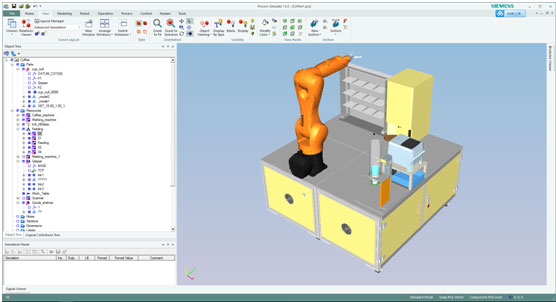 数字化双胞胎机器人咖啡吧是我院自主研发的用于展示互动和教学的智能制造工厂微缩原型系统。该系统结合互联网+应用,实现了互联网营销、销售订单管理、生产自动排程、机器人自动生产、数字标签打码,自动仓储与物流等智能制造工厂业务功能,能开展全方面的智能制造教学与培训。该系统还结合了西门子数字化“双胞胎”技术,完成全产线的虚拟仿真模型搭建,实现电脑仿真模型与实体产线的实时同步,仿真程序可直接导入实际产线运行,大大缩短工业实施周期,也提供了虚实结合的创新教学形式。